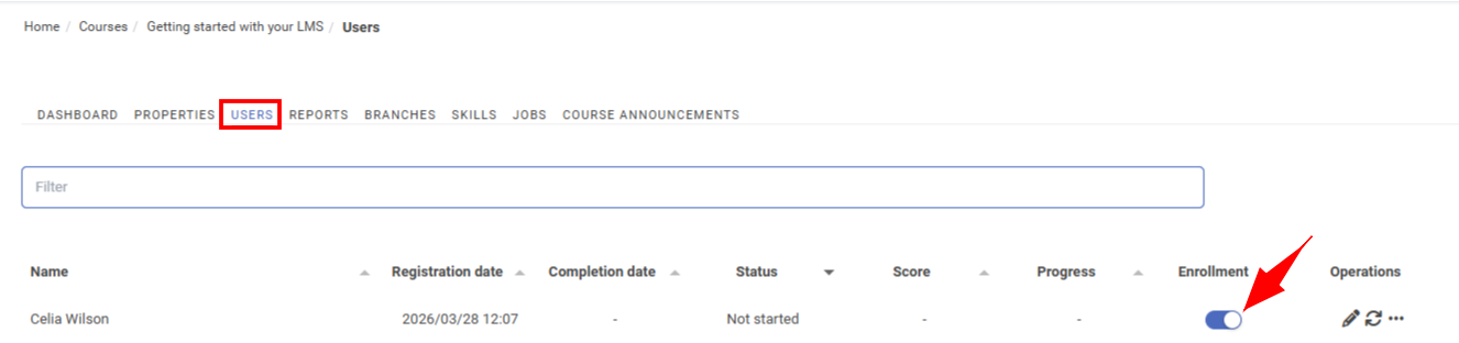 Step 3:Under the 'users' tab click the switch under enrollment to toggle the users participation in the course on or off'