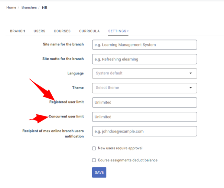 Concurrent User limit: Here, you can set the total number of users allowed to be logged in to the branch
